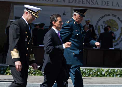 El presidente Enrique Peña Nieto, acompañado por los secretarios de Marina, almirante Vidal Francisco Soberón Sanz, y de la Defensa Nacional, general Salvador Cienfuegos Zepeda, encabezó en la ciudad de México la ceremonia por el Día de la Armada Foto Cristina Rodríguez