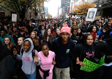 Manifestantes repudian en el centro de Seattle el fallo de un jurado investigador que decidió no fincar cargos al policía blanco Darren Wilson por matar al joven afroestadunidense Michael Brown, en Ferguson, Misuri, el 9 de agosto. Ayer ocurrieron más protestas en Nueva York, Los Ángeles, Filadelfia, Chicago, Cleveland, Oakland, Newark, Atlanta, San Francisco y Mineápolis, entre otras Foto Ap