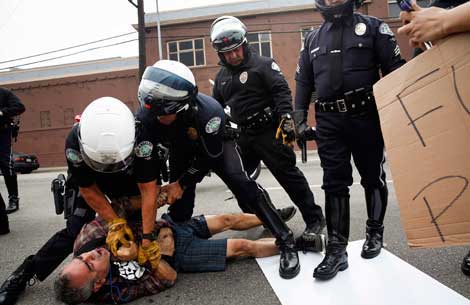 Policías de Los Ángeles someten a un manifestante que participó en una movilización contra el fallo de un jurado investigador que decidió no presentar cargos al agente blanco Darren Wilson por matar al joven afroestadunidense Michael Brown, en Ferguson, Misuri. En las muestras de repudio se incluyó la muerte de Ezell Ford, de 25 años, a manos de las fuerzas del orden angelinas. También hubo protestas en Nueva York, Washington y Minneápolis, entre otras. El presidente Barack Obama sostuvo una reunión con su gabinete para abordar la situación Foto Reuters