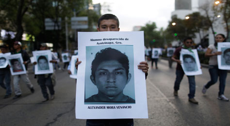 Especialistas de la Universidad de Innsbruck, Austria, enviaron a autoridades mexicanas y al equipo argentino de antropología forense los primeros resultados de sus investigaciones sobre los restos localizados en el basurero y en la margen del río San Juan, en Cocula, Guerrero. Los estudios identificaron a Alexander Mora Venancio, de 19 años, desaparecido en Iguala junto con otros 42 normalistas la noche del 26 de septiembre. La información fue confirmada por la Normal Rural Raúl Isidro Burgos y por funcionarios federales. En la imagen, aspecto de una de las protestas de ayer en el Distrito Federal Foto Reuters