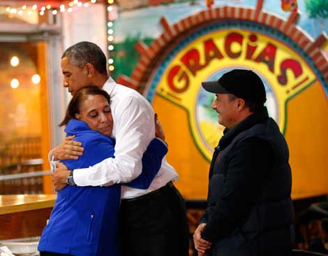 Durante su visita a un restaurante de comida mexicana en Nashville, Tenesi, el presidente de Estados Unidos, Barack Obama, se dio tiempo para saludar a Lilia y Carlos Yépez, una pareja de inmigrantes latinoamericanos Foto Reuters