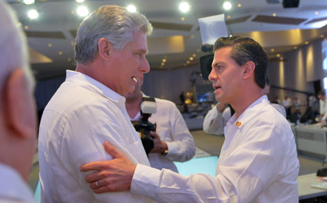 Durante la clausura de la 24 Cumbre Iberoamericana, en Veracruz, el presidente Enrique Peña Nieto saludó al primer vicepresidente de Cuba, Miguel Díaz Canel, quien insistió en la demanda de que Estados Unidos excluya a la isla de su ilegítima lista de patrocinadores del terrorismo Foto Presidencia