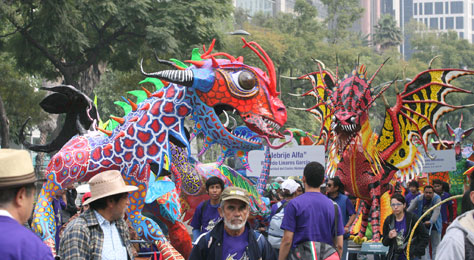 Alebrijes monumentales desfilaron por el Paseo de la Reforma y se dirigieron al camellón de Álvaro Obregón, donde serán exhibidos hasta el próximo día 21. Dragones con cola de escorpión, anfibios, felinos y extraños insectos formaron parte de la procesión de más de 200 piezas, elaboradas a partir de una convocatoria emitida por el Museo de Arte Popular Foto Guillermo Sologuren