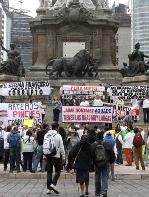Cientos de ahorradores defraudados por Ficrea marcharon ayer del Ángel de la Independencia a la Bolsa Mexicana de Valores, y desde ahí a Gobernación, donde solicitaron la intervención del titular de la dependencia, Miguel Ángel Osorio Chong, ante su homólogo de Hacienda, Luis Videgaray, para que les devuelvan sus depósitos. Funcionarios de nivel medio les pidieron que redacten un escrito para detallar su solicitud Foto Guillermo Sologuren