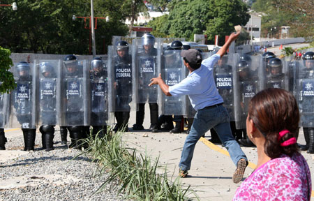 Unos 150 profesores se enfrentaron en el istmo de Tehuantepec con policías federales durante la visita del presidente Enrique Peña Nieto al estado. Los mentores lanzaron piedras a los agentes, quienes respondieron con gas lacrimógeno. En tanto, el mandatario sostuvo que este año se percibirán los efectos de las reformas estructurales; agregó que los mexicanos serán los jueces que evaluarán los beneficios de esas enmiendas Foto Jorge Pérez Alfonso
