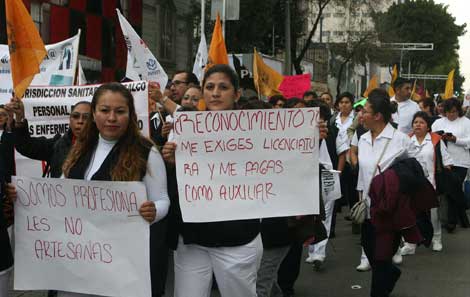 Personal de enfermería de diferentes instituciones, con las y los trabajadores de la Ssa al frente, realizó ayer una nueva marcha a la sede de la dependencia federal para refrendar su exigencia de que el programa de profesionalización, que sólo se aplica para quienes tienen plazas federales, se extienda a todas las instancias del sector. Marchas similares se realizaron en ocho estados. La titular del ramo, Mercedes Juan López, dijo que la inconformidad se debe a una
