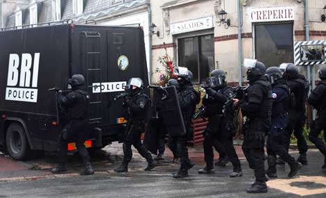 Oficiales antimotines patrullan las calles de la ciudad de Longpont, en el norte de París, donde ayer se reportaron disparos y explosiones durante la jornada de duelo realizada luego de la matanza fundamentalista perpetrada contra la revista Charlie Hebdo. A un día de los acontecimientos, miembros de la comunidad musulmana en Francia manifestaron su preocupación ante eventuales actos de represalia por el atentado en que murieron 12 personas Foto Ap