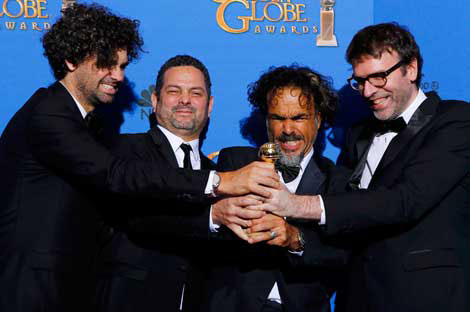 La cinta Birdman, dirigida por Alejandro González Iñárritu, se alzó con los premios al mejor guión y al mejor actor de comedia, en la persona de Michael Keaton. En la imagen, captada en el hotel Beverly Hilton, de Los Ángeles, aparecen Armando Bo, Alexander Dinelaris Jr., el cineasta mexicano y Nicolas Giacobone, al momento de recibir el reconocimiento. En el acto, organizadores y actores manifestaron su solidaridad con las víctimas del terrorismo en Francia Foto Reuters