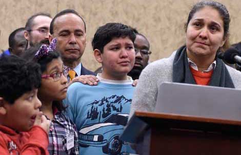 Isabel Aguilar habla a los medios de comunicación frente al Capitolio, en Washington, acompañada por sus tres hijos, quienes podrían ser deportados si el Congreso estadunidense aprueba los cambios propuestos por la bancada republicana. Varias organizaciones denunciaron que lo que se busca con esta medida es afectar a los trabajadores y a sus familias. Detrás de la inmigrante y los niños aparece el representante demócrata Luis V. Gutiérrez Foto Ap