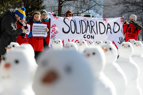 Muñecos de nieve enmarcan la manifestación afuera de la sede del 45 Foro Económico Mundial de Davos en apoyo a los familiares de los 43 normalistas de Ayotzinapa desaparecidos el 26 y 27 de septiembre pasado en Iguala, Guerrero. El encuentro de empresarios y gobiernos concluyó ayer con mejores expectativas para el crecimiento mundial, sustentadas en el repunte de Estados Unidos, los bajos precios del petróleo y el relanzamiento de la zona euro Foto Ap