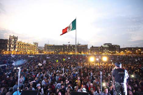 Cuatro marchas confluyeron en la plancha del Zócalo capitalino al cumplirse ayer cuatro meses de la desaparición de 43 estudiantes de la Escuela Normal de Ayotzinapa: al norte una partió de Indios Verdes; al sur, de Taxqueña; al oriente, de la calzada Ignacio Zaragoza, y al poniente, del Auditorio Nacional. Familiares de las víctimas exigieron abrir nuevas líneas de investigación que incluyan al ex gobernador Ángel Aguirre Rivero Foto Pablo Ramos