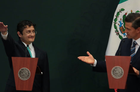 El presidente Enrique Peña Nieto toma la protesta a Virgilio Andrade Martínez como nuevo titular de la Secretaría de la Función Pública, en una ceremonia en Los Pinos. La primera instrucción del mandatario al funcionario fue investigar si hubo conflicto de intereses en la compra de las casas de su esposa Angélica Rivera; del secretario de Hacienda, Luis Videgaray, y de él mismo con su residencia en Ixtapan de la Sal Foto Francisco Olvera