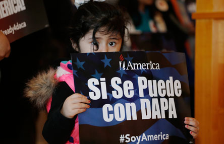Durante una conferencia de prensa en la Biblioteca Pública de Denver, la pequeña Genesis Moreno desplegó un cartel de apoyo al plan de Acción Diferida para Padres de Ciudadanos Estadunidenses y Residentes Legales (DAPA, por sus siglas en inglés), que impulsa el gobierno de Barack Obama y que permite regularizar la estancia de migrantes. El programa quedó momentáneamente paralizado por la suspensión temporal que emitió un juez texano Foto Ap