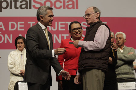 Miguel Ángel Mancera, jefe de Gobierno del Distrito Federal, encabezó en el Auditorio Nacional la ceremonia de entrega de tarjetas de pensión alimentaria a adultos mayores. Informó que en lo que va de su gestión se han integrado a este programa entre 87 mil y 89 mil personas mayores de 68 años, y espera que la cifra aumente a 100 mil. Rosa Icela Rodríguez, secretaria de Desarrollo Social, atestiguó el acto Foto Yazmín Ortega Cortés
