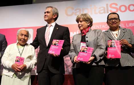 Miguel Ángel Mancera, jefe de Gobierno del Distrito Federal; Alicia Bárcena, secretaria ejecutiva de la Comisión Económica para América Latina y el Caribe (Cepal), y Rosa Icela Rodríguez, titular de la Secretaría de Desarrollo Social local, participaron en la presentación del libro Autonomía y dignidad en la vejez: teoría y práctica en políticas de derechos de las personas mayores, editado por el organismo internacional y el gobierno capitalino. Ernestina Victoria Escalante Duarte, quien aparece en la portada de la obra, fue invitada a acompañarlos Foto Jesús Villaseca
