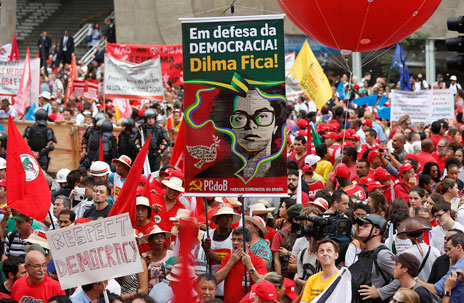 Miles de estudiantes, sindicalistas y campesinos se manifestaron pacíficamente este viernes en casi todo Brasil en defensa de la democracia y de la paraestatal Petrobras, la cual se encuentra inmersa en un megaescándalo de corrupción. Según la Central Única de Trabajadores, que convocó la movilización, en total salieron a las calles 148 mil ciudadanos, 100 mil de ellos en Sao Paulo. En tanto, desde la oposición se incrementan los llamados a protestar este domingo contra la presidenta Dilma Rousseff Foto Ap