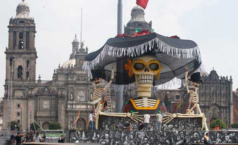 En la plancha del Zócalo se mantiene parte de la escenografía de Spectre, la película sobre James Bond que se rueda en algunas zonas del Centro Histórico de la ciudad de México. Miguel Ángel Mancera, jefe de Gobierno del Distrito Federal, expuso ayer que agentes de protección civil estarán de manera permanente en las locaciones, luego de que un cortocircuito en una mufa (registro eléctrico) provocó un pequeño incendio en una de la unidades móviles que se utilizan en las grabaciones de la cinta Foto Carlos Ramos Mamahua