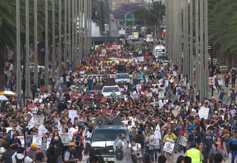 Padres de los 43 estudiantes normalistas de Ayotzinapa desaparecidos encabezaron la marcha del Ángel de la Independencia al Monumento a la Revolución para conmemorar los seis meses de los hechos de Iguala. Melitón Ortega, vocero de los familiares, dijo que este medio año ha sido de sufrimiento y de tristeza. Pero a pesar de que el gobierno ha tratado de acallar nuestras voces con su mentiras, seguiremos en la lucha para hallar la verdad Foto Víctor Camacho