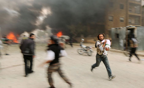 Al menos 2 mil personas fueron desalojadas ayer del campo de refugiados palestino de Yarmuk, en la capital, Damasco, luego de que el grupo Estado Islámico tomó parcialmente el control y que aviones del gobierno sirio bombardearon el lugar. La ofensiva aérea ocurrió mientras las tropas del régimen del presidente Bashar Assad atacaron varios distritos, donde los yihadistas luchan desde hace varios días contra la facción palestina radical Aknaf Beit Makdis. En la imagen, un hombre lleva a un menor herido en la ciudad de Idlib tras el avance gubernamental Foto Reuters