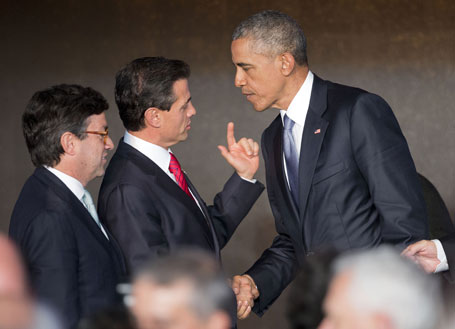 El presidente de Estados Unidos, Barack Obama, charló con su homólogo mexicano Enrique Peña Nieto y lo felicitó por la reforma energética y por la sobresaliente coordinación en materia de seguridad. Los acompaña Luis Alberto Moreno, dirigente del Banco Interamericano de Desarrollo Foto Ap