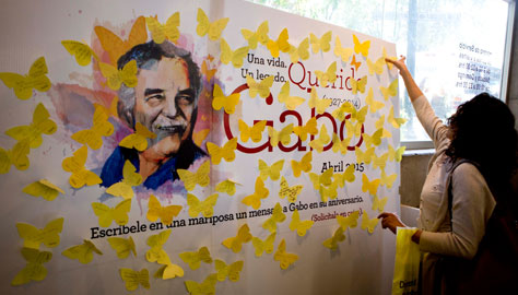 Con motivo del primer aniversario luctuoso de Gabriel García Márquez, premio Nobel de Literatura 1982, en México se realizarán lecturas colectivas de sus libros, conferencias y el sorteo de colecciones de la obra completa del escritor. Además, 180 librerías del país y Centroamérica participan en la campaña convocada por editorial Planeta, en la que cada uno de esos espacios dedica un muro a Gabo, donde los visitantes colocan mensajes y reflexiones en mariposas amarillas de papel. En su natal Colombia se dedicará al narrador la Feria Internacional del Libro de Bogotá, además de varios homenajes en Cartagena y otras ciudades de esa nación. La imagen, en el Distrito Federal Foto Ap