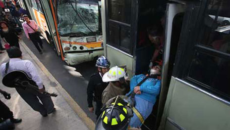 Unas 20 personas resultaron lesionadas cuando un camión de la Red de Transporte de Pasajeros (RTP) chocó con un microbús de la ruta 44 (en la imagen) en la avenida Tláhuac, colonia Granjas Estrella; seis requirieron hospitalización. En Periférico Sur y calle Céfiro, una pipa de Azteca Gas se estrelló con una unidad del transporte público con saldo de dos heridos. En la avenida Gustavo Díaz Ordaz, colonia Jalalpa, delegación Álvaro Obregón, un autobús quedó sin frenos, impactó varios vehículos y atropelló a tres personas. Finalmente, una usuaria del Metrobús requirió atención médica cuando un auto particular se pasó un alto en Viaducto Río Piedad y Cuauhtémoc y fue golpeado por la unidad pública Foto Alfredo Domínguez