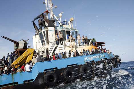 La guardia costera italiana informó que en su operación de sábado y domingo trasladó cientos inmigrantes a las costas del país africano y otros a las islas de Lampedusa y Sicilia. El gobierno de Trípoli reportó que las autoridades frenaron la travesía de 500 (en la imagen) y detuvieron en tierra a otros 450. A ellos se suman una cantidad similar que salvó la marina griega en el mar Egeo, y otras tres docenas que recibieron ayuda frente a los litorales de Egipto. Pese a la vigilancia, el flujo de gente desesperada por llegar a Europa se ha acelerado Foto Reuters