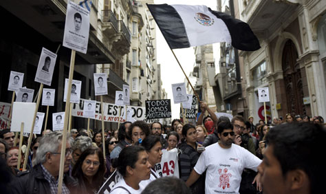 Con la leyenda fue el Estado impresa en pancartas, familiares de los 43 normalistas de Ayotzinapa desaparecidos el pasado 26 de septiembre en Iguala marcharon este viernes en Montevideo para exigir justicia y que no vuelva a haber hogares destrozados, como parte de la caravana que realizan por Sudamérica para denunciar lo que ocurre en México. En tanto, en Tixtla, Guerrero, policías antimotines desalojaron violentamente a padres de las víctimas y a estudiantes cuando retiraban propaganda electoral Foto Xinhua