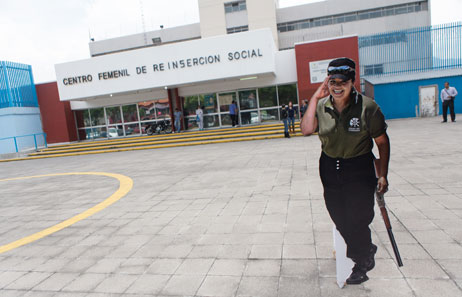 Después de varias horas de viaje desde Nayarit, Nestora Salgado García, coordinadora de la Policía Comunitaria de Olinalá, Guerrero, ingresó ayer por la tarde a la Torre Médica del penal de Tepepan, en la ciudad de México, para ser atendida luego de 25 días en huelga de hambre y por problemas de salud que presenta desde hace años. En primer plano, foto de la comandanta en cartón colocada por sus hijos en la explanada del reclusorio Foto Pablo Ramos