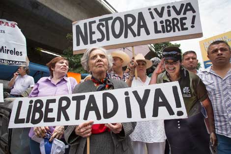 La escritora Elena Poniatowska se sumó a la movilización de diversas agrupaciones sociales frente al Centro Femenil de Readaptación Social Tepepan para exigir la liberación de la comandanta de la policía comunitaria de Olinalá, acusada de secuestro Foto Pablo Ramos