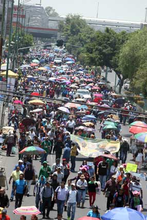 Miles de profesores de Oaxaca, Michoacán y Chiapas arribaron ayer a la ciudad de México para exigir la reinstalación de la mesa de diálogo. Realizaron dos marchas: una partió de la Estela de Luz a la Torre del Caballito, donde bloquearon Paseo de la Reforma, y otra se movilizó de la Cámara de Diputados al cruce de Bucareli y avenida Chapultepec Foto Jesús Villaseca