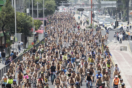 Cientos de ciclistas pasearon ayer desnudos, con el cuerpo pintado o con máscaras por Paseo de la Reforma, Eje Central, Avenida Juárez e Insurgentes en la ciudad de México Foto Yazmín Ortega Cortés