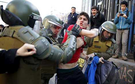 Con el clamor de que sin maestros no hay reforma, decenas de miles de docentes de escuelas públicas, que están en huelga por tiempo indefi nido desde hace 17 días, marcharon ayer en rechazo al proyecto de ley que normará sus funciones, así como por reivindicaciones en sus derechos laborales. En la segunda movilización del gremio en una semana, el Colegio de Profesores pide el retiro del proyecto de ley de nueva carrera presentado por el Ejecutivo. Al final de la protesta hubo algunos enfrentamientos con la policía Foto Reuters