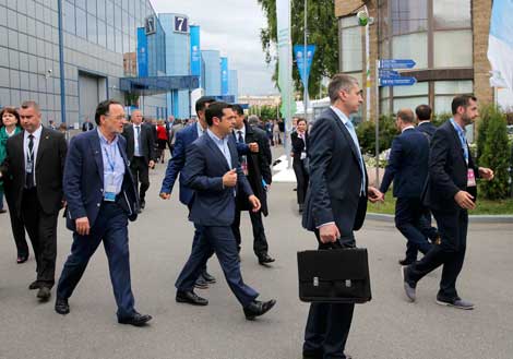 El primer ministro griego, Alexis Tsipras (al centro), acudió al Foro Económico Internacional en San Petesburgo. En la visita oficial está incluida una reunión para hoy con el presidente Vladimir Putin. El Kremlin rechazó las especulaciones de que acudiría al rescate financiero de Atenas Foto Reuters