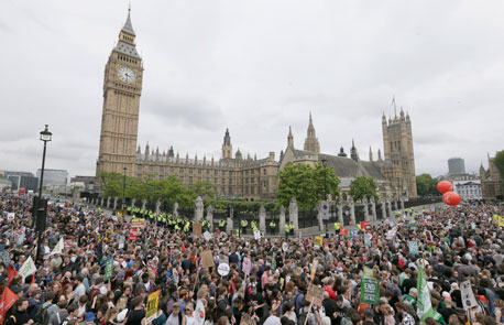 Decenas de miles se manifestaron este sábado frente al Parlamento británico para protestar contra los planes del primer ministro, David Cameron, de recortar 19 mil millones de dólares al gasto de seguridad social. Argumenta que los altos niveles de deuda pública harían vulnerable a Gran Bretaña si hubiera otra crisis financiera global Foto Ap