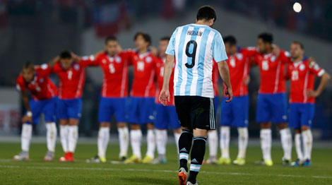 Chile quebró un maleficio de casi un siglo al ganar por primera vez la Copa América, tras superar 4-1 a la favorita Argentina, cuyos jugadores arrastraban las piernas en el tiempo extra y llegaron sin aliento a la definición por penales, en los que solamente anotó Lionel Messi. En la imagen, Gonzalo Higuaín luego de fallar su tiro de castigo Foto Reuters