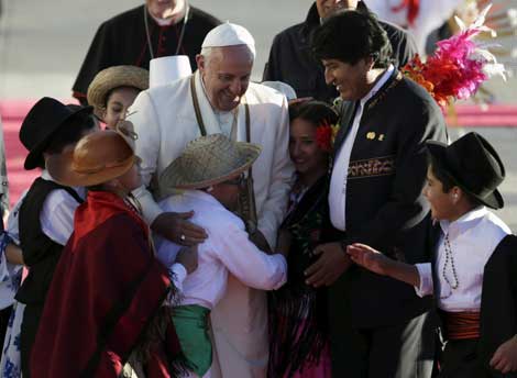 El papa Francisco fue rodeado por niños en la bienvenida del presidente de Bolivia, Evo Morales, en el aeropuerto El Alto. El pontífice argentino llega a un país con múltiples cambios: es un Estado plurinacional, laico y multicultural, en el que se reivindican los valores e identidades indígenas Foto Reuters