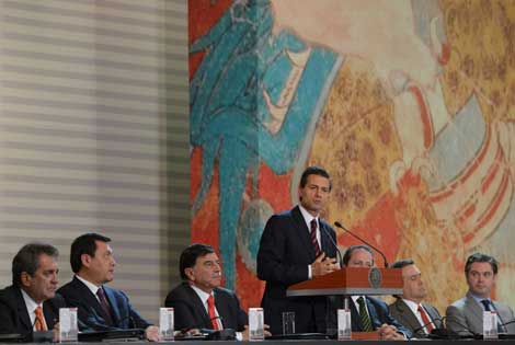 El presidente Enrique Peña Nieto encabezó la clausura de la 49 reunión de la Conferencia Nacional de Gobernadores (Conago), en Tlaxcala. Expuso a los mandatarios y a integrantes de su gabinete que son tiempos de unidad nacional y de trabajo corresponsable en favor de la población Foto Notimex