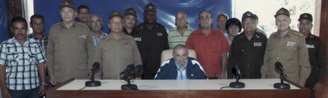 Fidel Castro, quien el 13 de agosto cumplirá 89 años, apareció en público por segunda ocasión en menos de siete días, en un encuentro con jefes, oficiales y trabajadores civiles del Ministerio del Interior y de las Fuerzas Armadas Revolucionarias Foto Xinhua