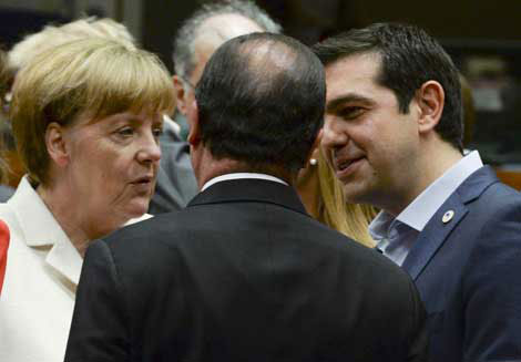 La canciller de Alemania, Angela Merkel, el primer ministro de Grecia, Alexis Tsipras, y el presidente de Francia, Francois Hollande (de espalda), durante las negociaciones en Bruselas de los líderes de la eurozona para mantener al país helénico en la unión monetaria Foto Reuters