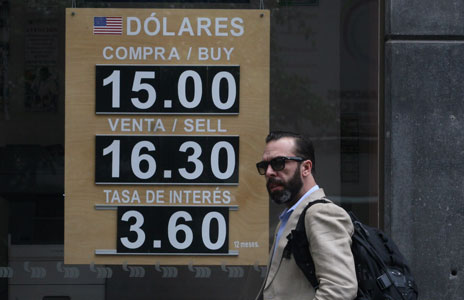 En lo que va de 2015, el peso acumula una devaluación de 7.30 por ciento frente al dólar, según registros del Banco de México. Ayer se vendió en $15.9121 en el mercado de cambios al mayoreo. En ventanillas bancarias y casas de cambio la divisa se vendió al menudeo hasta en $16.30. Desde el inicio de la gestión de Enrique Peña Nieto el peso se ha devaluado 23 por ciento, cifra mayor a los gobiernos de dos sexenios anteriores Foto Guillermo Sologuren