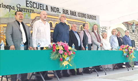 Un grupo de escritores, actores y cineastas asistió a la clausura del ciclo escolar 2011-2014, en la Normal Rural Raúl Isidro Burgos. En la imagen, Bardomiano Martínez Astudillo, subdirector académico; Luis Hernández Navarro, Armando Bartra; José Luis Hernández Rivera, director de la institución; Héctor Bonilla, Gabriel Retes, Elena Poniatowska, Martha Lamas, Rigoberto Barrera, subdirector administrativo, y Rafael Barajas El Fisgón. Entre los padrinos estuvo Juan Villoro, mientras Paco Ignacio Taibo II envió saludos mediante un mensaje grabado Foto Sergio Ocampo