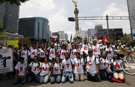 Decenas de personas, entre ellos fotógrafos, marcharon del Ángel de la Independencia a las instalaciones de la Procuraduría General de Justicia del Distrito Federal para demandar que se investigue a fondo y se haga justicia por el asesinato del fotoperiodista Rubén Espinosa, la activista Nadia Vera, Alejandra Negrete, Yesenia Quiroz y la colombiana Mile Virginia Martín. Insistieron en que el gobernador de Veracruz, Javier Duarte, sea investigado, pues el reportero gráfico abandonó esa entidad por amenazas a su trabajo profesional Foto Víctor Camacho