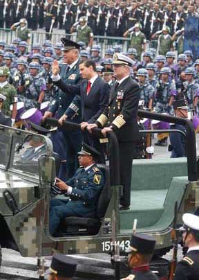 El presidente Enrique Peña Nieto pasa revista a los contingentes apostados en el Zócalo capitalino, antes de la parada con motivo del 205 aniversario de la Independencia. La Fuerza Aérea Mexicana encabezó el festejo en ocasión del centenario del surgimiento de la aviación militar en el país. Se esperaba el vuelo de 160 aeronaves, pero las condiciones climatológicas no lo permitieron Foto Carlos Ramos Mamahua
