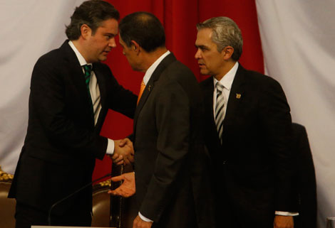 Miguel Ángel Mancera, jefe de Gobierno del Distrito Federal, saluda al secretario de Educación Pública, Aurelio Nuño, quien acudió al tercer Informe del mandatario capitalino en representación del presidente Enrique Peña Nieto. De espaldas, Armando López Velarde, presidente de la mesa directiva de la ALDF Foto Carlos Ramos Mamahua