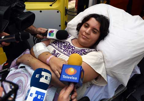 Colette Gaxiola, una de los seis sobrevivientes del ataque de las fuerzas armadas de Egipto contra un grupo de turistas el pasado 13 de septiembre, en el que murieron ocho mexicanos y cuatro guías locales, deja el hospital en el El Cairo para su traslado al avión presidencial de México Foto Afp