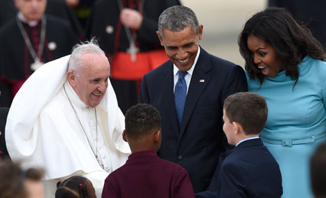 El papa Francisco saluda a unos niños tras su arribo a la base aérea Andrews, en Maryland, donde fue recibido por el presidente estadunidense Barack Obama y su esposa, Michelle. El pontífice tendrá a partir de hoy una intensa agenda durante su visita a Washington, Nueva York y Filadelfia. Los principales actos públicos incluyen un discurso ante el Congreso, una misa en la catedral de San Patricio, una ponencia en la ONU, una magna misa en el Madison Square Garden y otra en una de las principales avenidas de Filadelfia, donde se anticipa un millón de asistentes Foto Ap