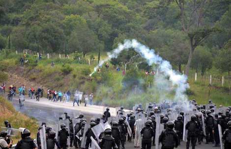 Policías de Guerrero lanzan gases lacrimógenos contra estudiantes normalistas, quienes responden con piedras y cohetones en la carretera federal Chilpancingo-Tixtla, en la zona conocida como Los Túneles. El zafarrancho se originó cuando los uniformados exigieron revisar un convoy de 11 autobuses y varios vehículos particulares que transportaban a familiares de los 43 estudiantes desaparecidos y alumnos normalistas, la mayoría de Ayotzinapa, hacia la ciudad de México, lo cual fue rechazado. En el lugar fue incendiado un camión de carga Foto Ap