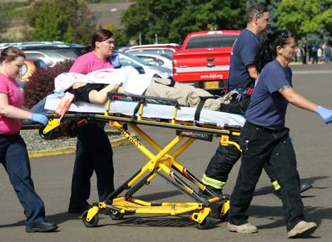 Cuerpos de rescate de Oregon trasladan a una de las víctimas del ataque de un tirador en la Universidad Umpqua Colegio Comunitario. El victimario, identificado como Chris Harper Mercer, abrió fuego en un aula. La policía llegó al campus tras un llamado al 911, se enfrentó al agresor y lo ultimó Foto Ap