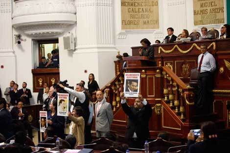 Legisladores de Morena mostraron imágenes de los delegados perredistas Víctor Hugo Lobo, Valentín Maldonado, Carlos Estrada y Dione Anguiano con la leyenda
